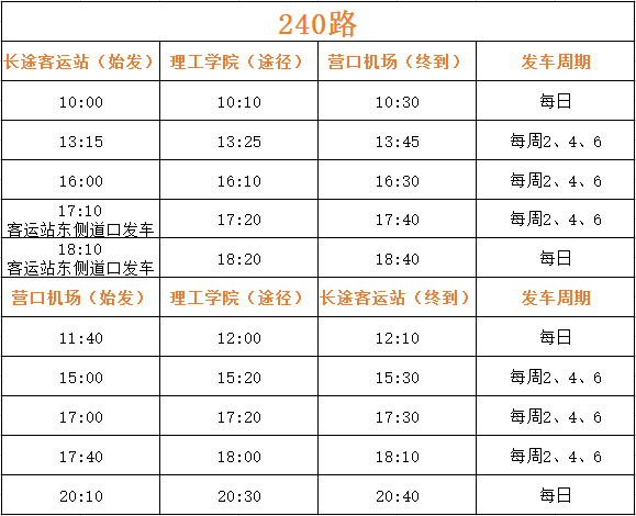 公汽公司從機(jī)場(chǎng)辦公室獲悉:從2017年8月1日起,營(yíng)口藍(lán)旗機(jī)場(chǎng)開(kāi)辟“營(yíng)口—濰坊—西安”新航線。針對(duì)上述情況,為方便市民出行,經(jīng)公司研究現(xiàn)提出調(diào)整機(jī)場(chǎng)240路運(yùn)營(yíng)班次。具體內(nèi)容如下: