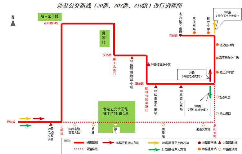 途徑封閉路段參照20路改行路線執(zhí)行,自龍山大街與繁榮路交匯處向南至東大歸到原線路運營。
